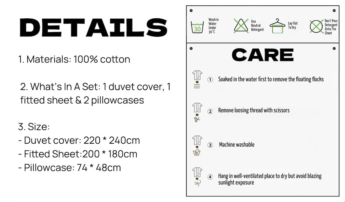 - Komplektacija: 1 antklodės užvalkalas, 2 pagalvių užvalkalai, 1 dovaninė paklodė su guma