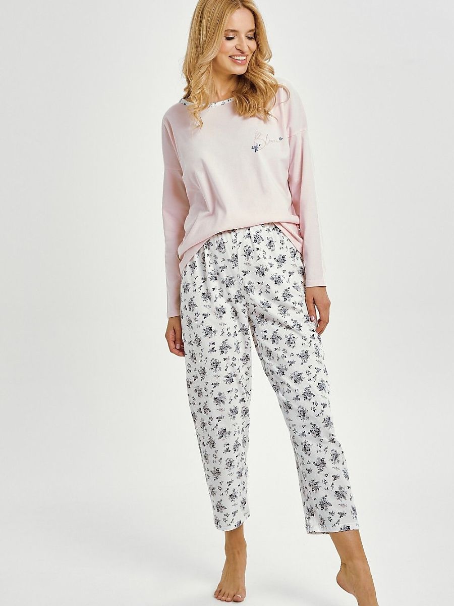 Dviejų dalių pižamos komplektas „Taro“ sujungia komfortą ir stilingą dizainą. Ilgomis rankovėmis palaidinė papuošta madingu užrašu, pagaminta iš švelnios, odai malonios medvilnės. Komplekte – patogios 7/8 ilgio kelnės su išraiškingu raštu, kuris suteikia visam deriniui lengvumo ir moteriško žavesio.